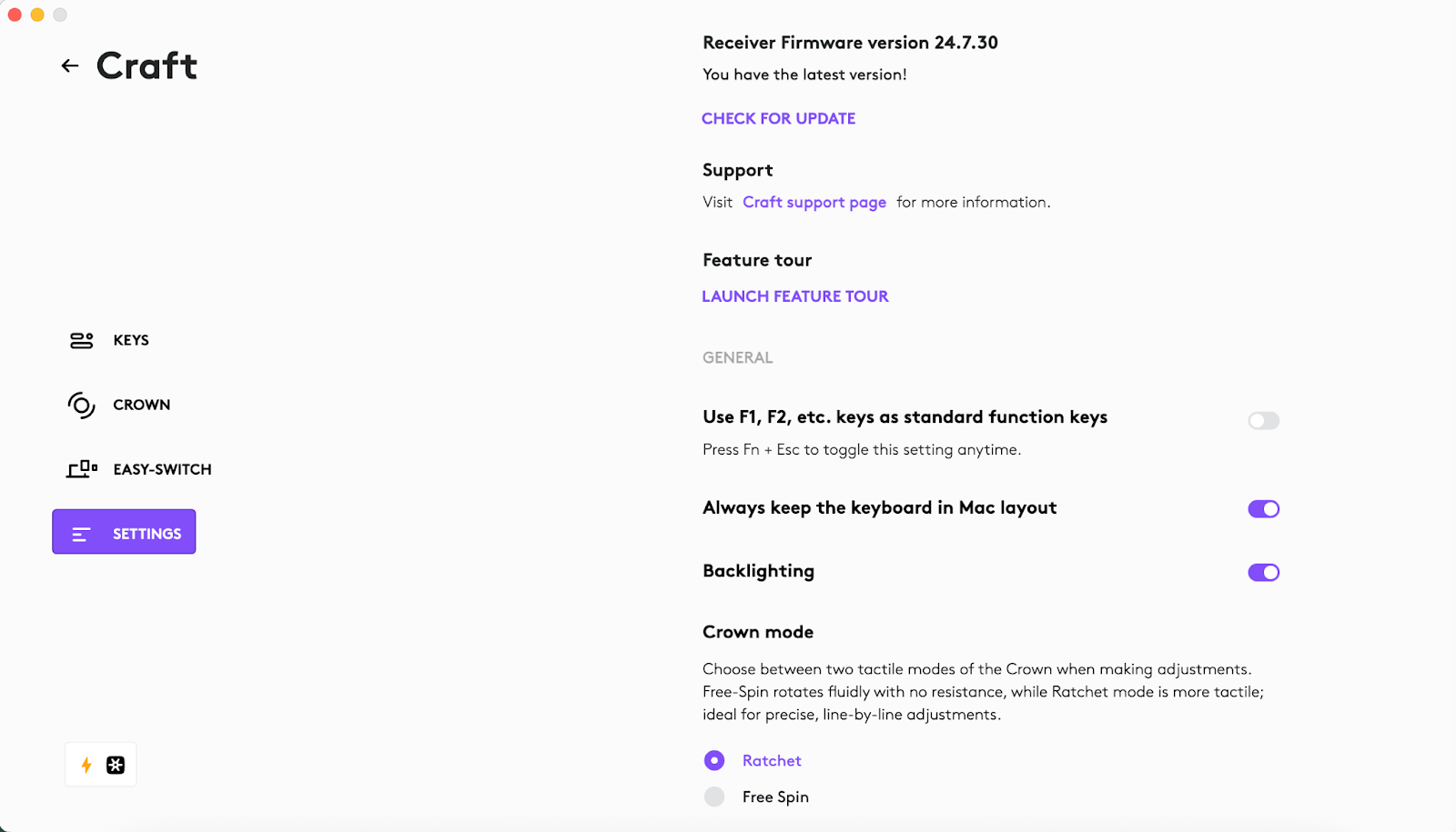 Craft-kronen har to taktile tilstande. Under Craft-siden Enhedsindstillinger i Options+ vil der være en ny konfigurationsmulighed: Kronetilstand. Kronetilstand har to valgmuligheder: