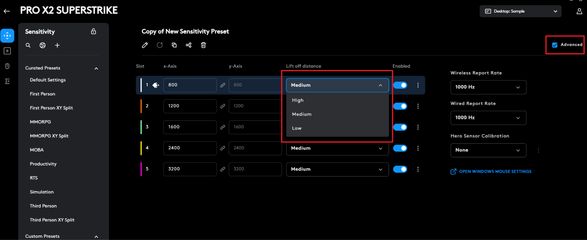 - Select a low, medium, or high LOD for each DPI slot.