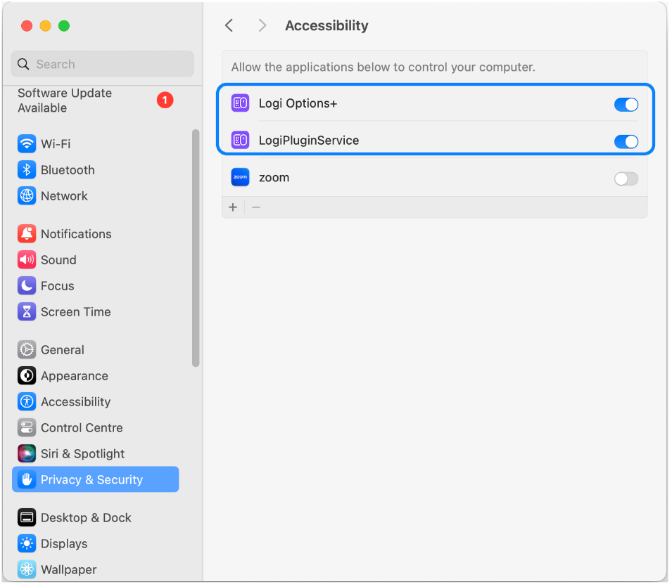 - Click the plus (+) icon, then go to Applications > Utilities, select Logi Plugin Service, and ensure the permission toggle is enabled.