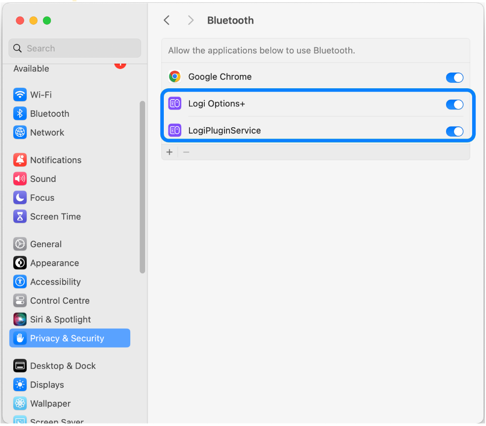- (Mac Only) Make sure that you have granted Bluetooth and Accessibility access to the LogiPluginService app.