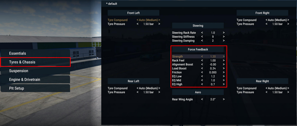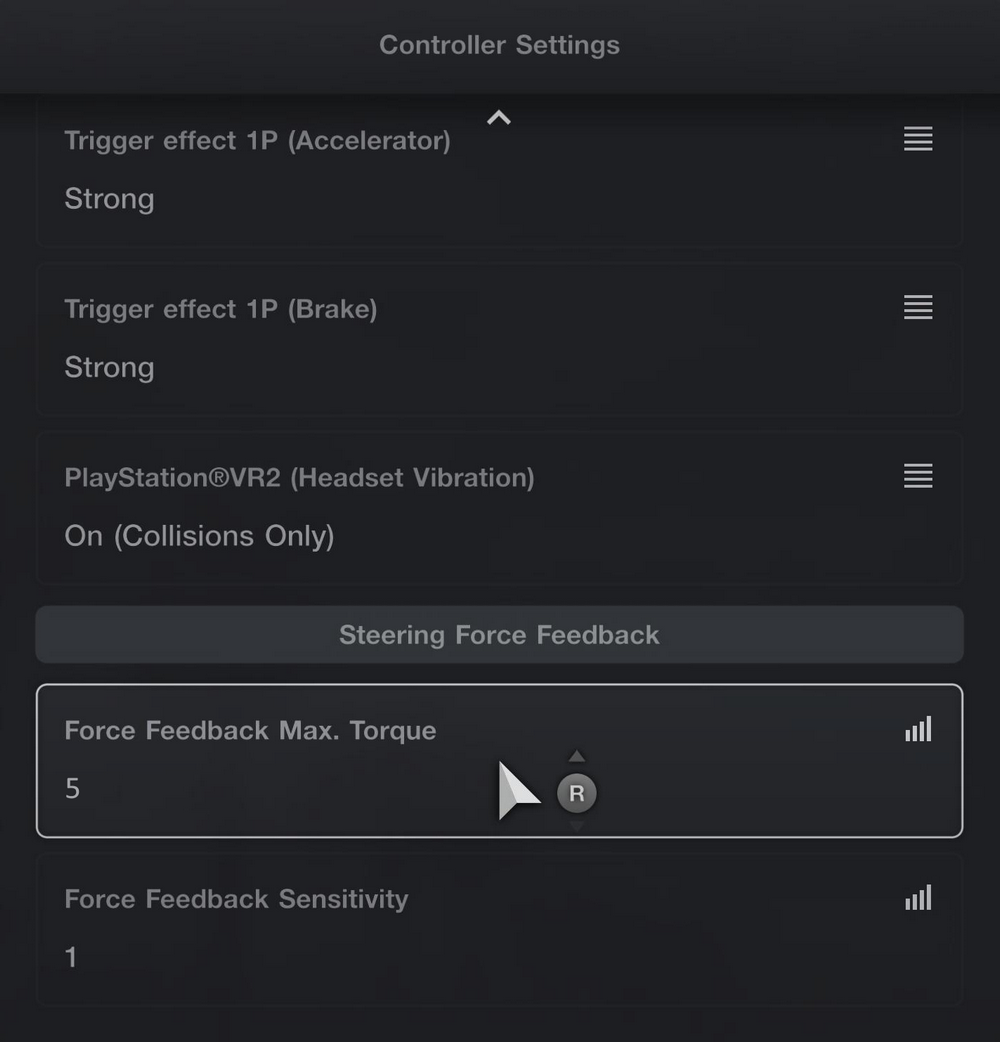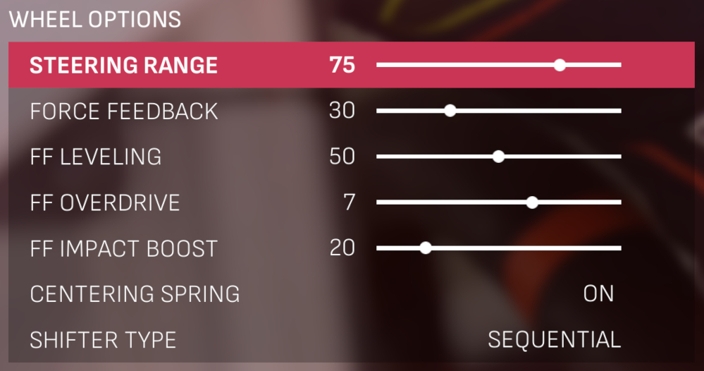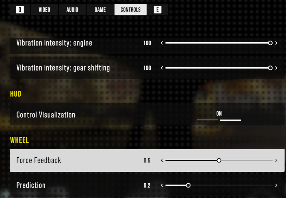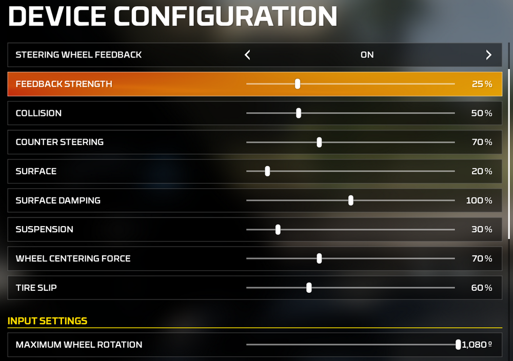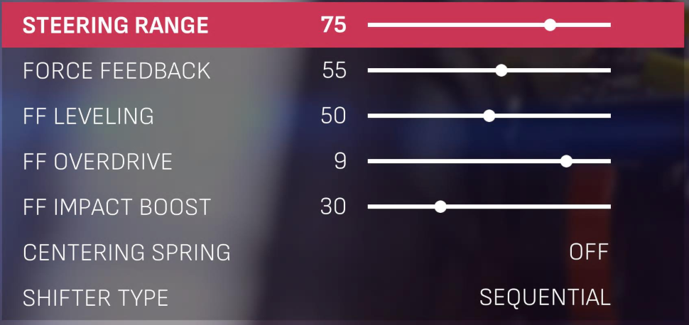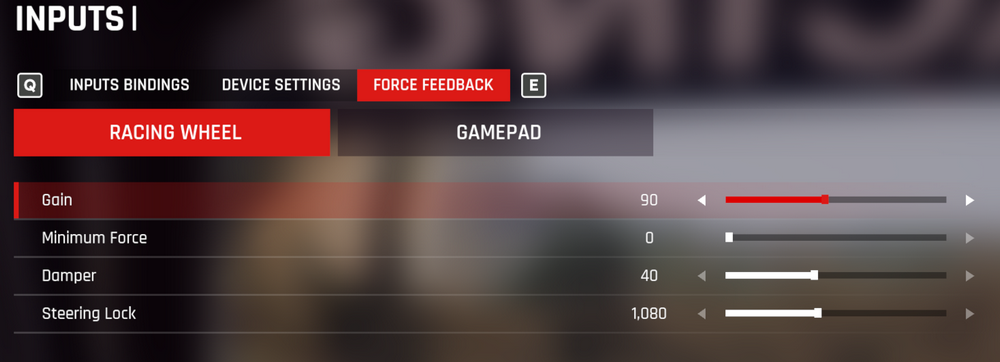 Because game settings are subjective, the following suggestions are to help you determine which settings may improve your game experience. Where relevant, we've included the wheel's settings display, as well as in-game settings. These settings all assume that your wheel is set to 11Nm of strength — you can set the dampener settings lower if you're running the wheel at a lower strength. Feel free to experiment with your own settings to personalize the wheel to your preference.