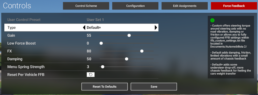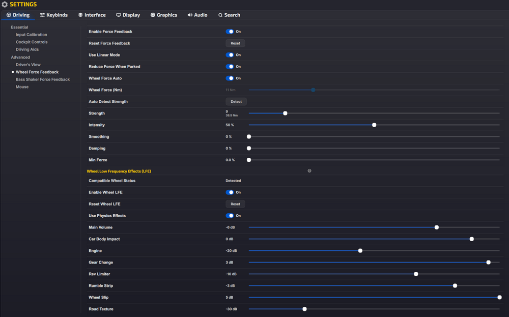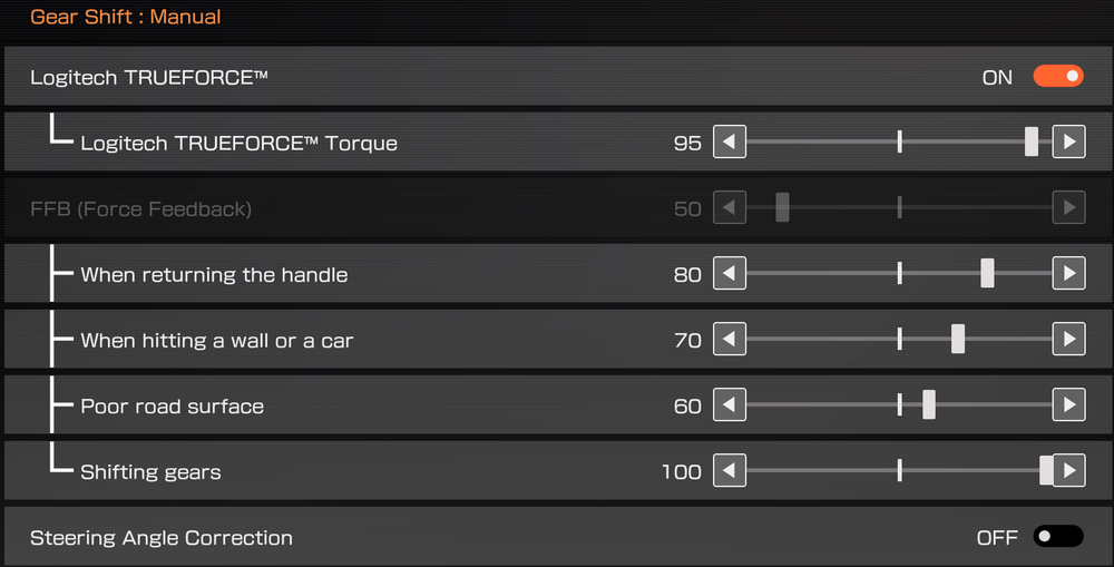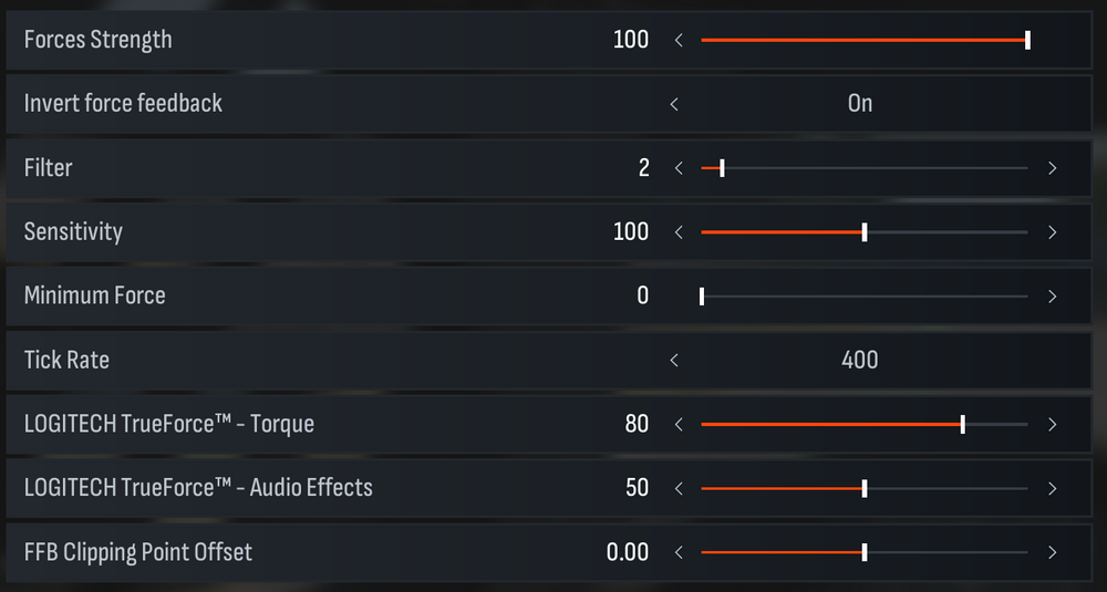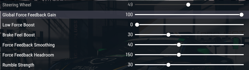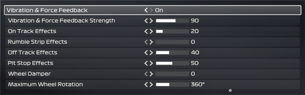 Adjusts the gain for the vibrotactile effects sent to the wheel in titles that utilize Trueforce. It's generally recommended to set this at a level that allows for subtle cues rather than overwhelming the overall experience.