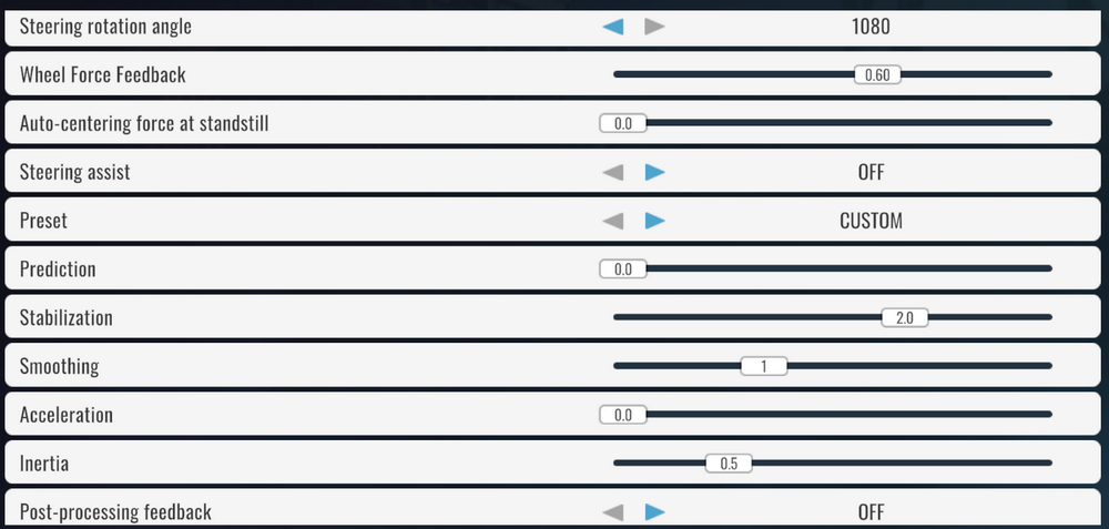 This allows you to adjust a filter setting that can help reduce unwanted effects from the game titles. High values will produce a smoother feeling from the wheel, whereas lower values will create a more "raw" experience; this is all about personal preference. The Auto setting will usually create the most ideal experience by attempting to match the filter to the rate at which the game title updates its force feedback.