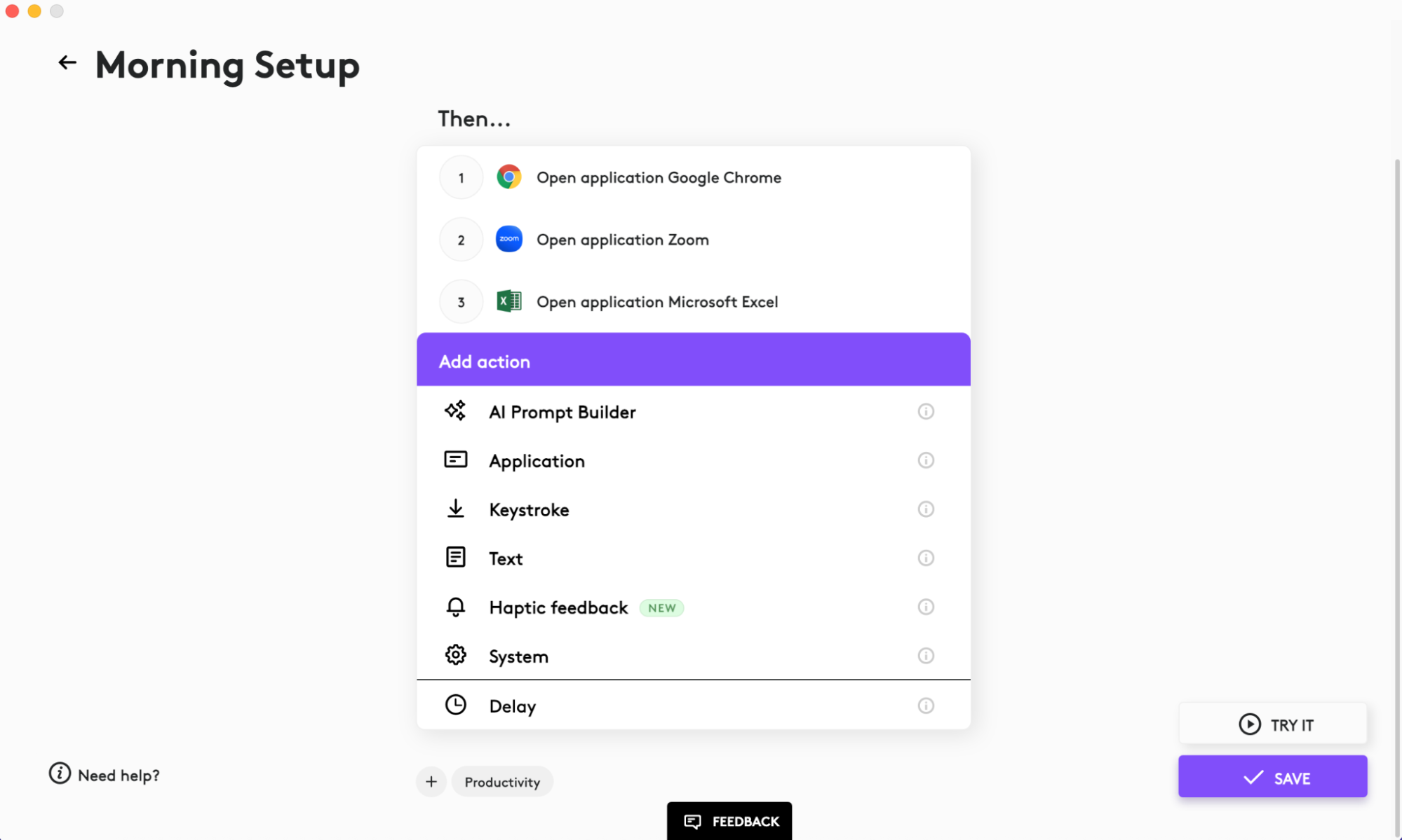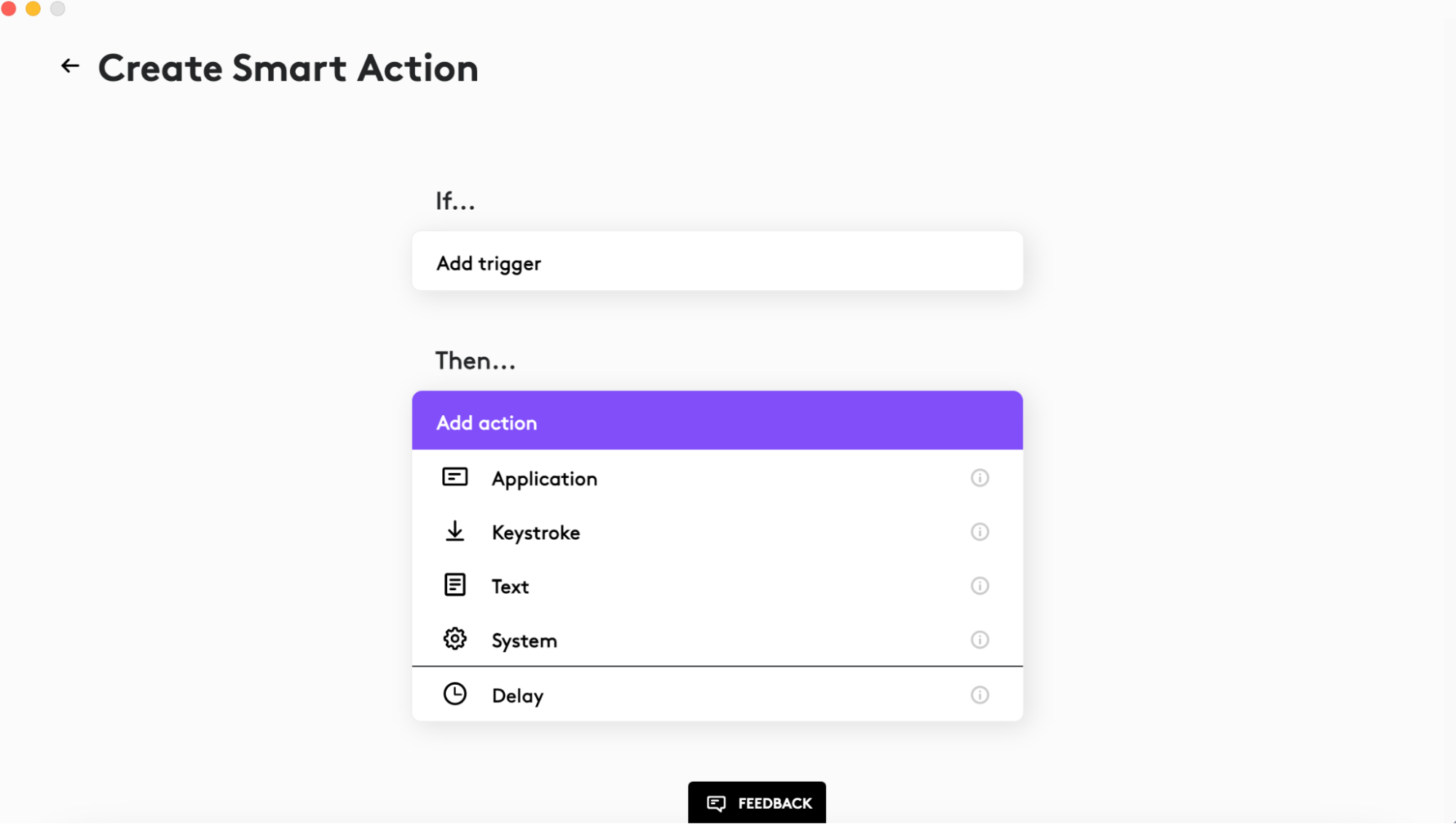 - To add an action click Add action, then select the action type from the dropdown list. You can set AI Prompt Builder, Application, Keystroke, Text, Haptic feedback (if MX Master 4 has been connected), and System actions. You can also set a Delay between those actions.