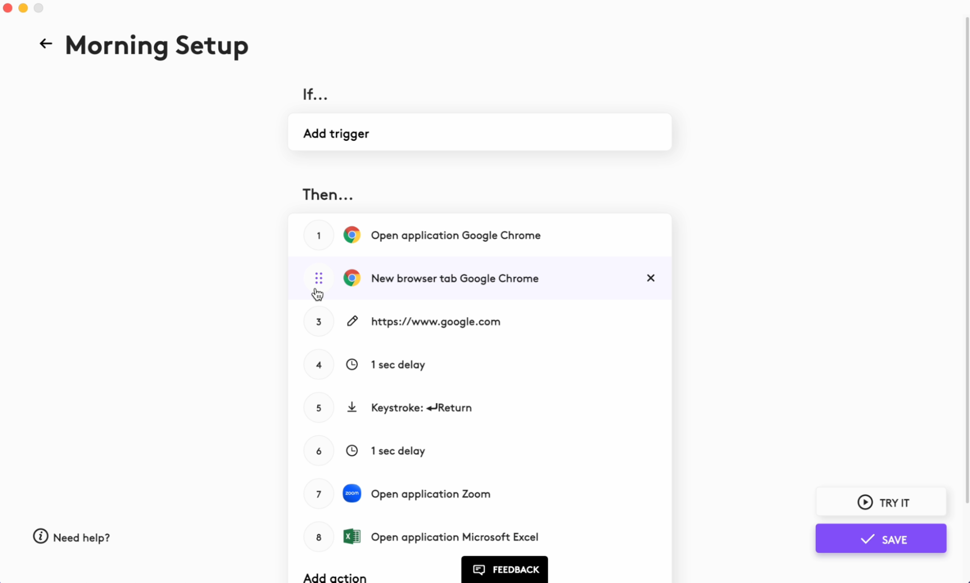 Adding a Delay is important for web based actions. For example, if you want to open a new browser tab in Google Chrome, the system needs time to perform the action. We recommend adding a 1 second delay for these types of actions.