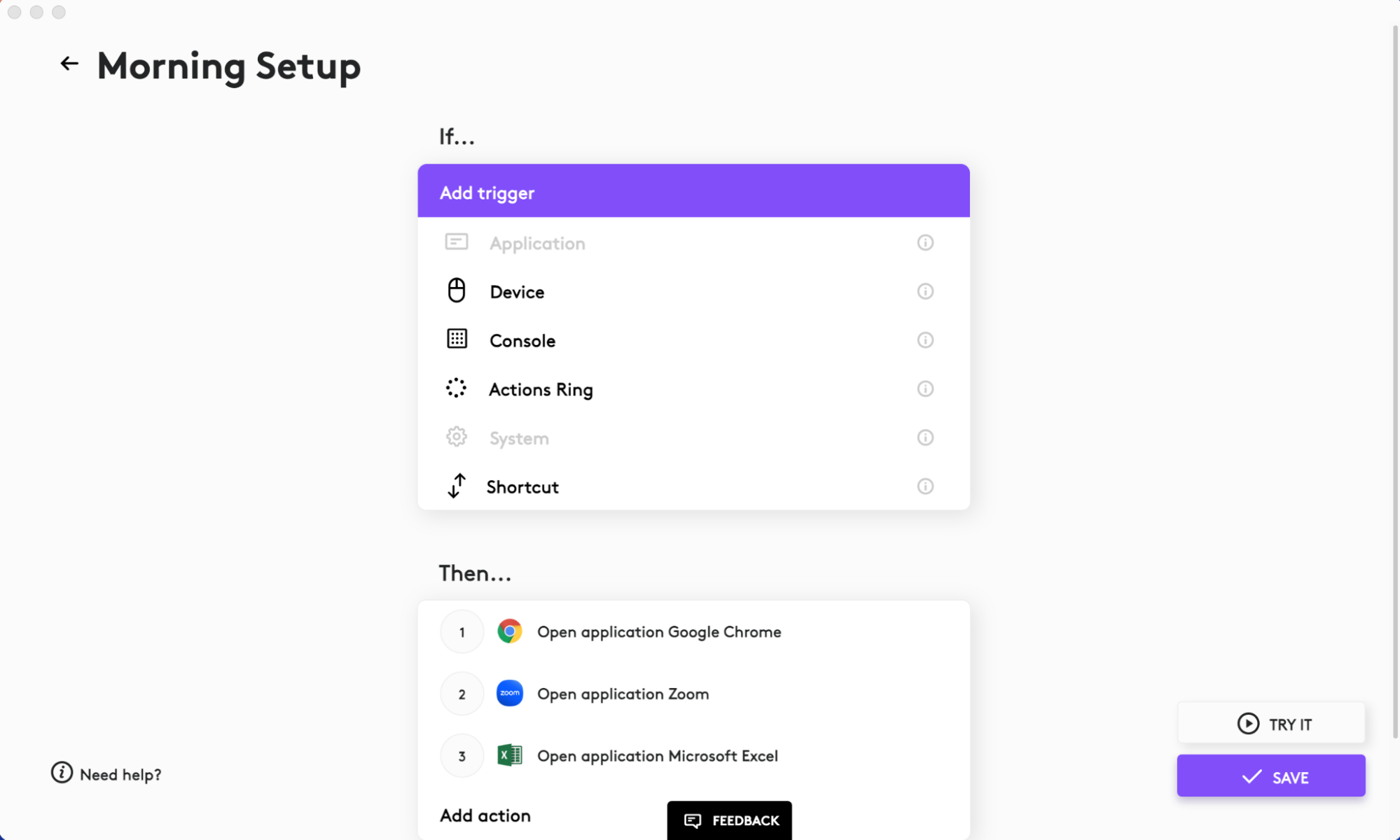 - To add a new trigger, click Add trigger, then select the trigger type from the dropdown list. Currently, Device, Console (is shown only if MX Creative Keypad and/or MX Creative Dialpad is connected), Actions Ring, and Shortcut triggers are available. Console and Actions Ring triggers can be assigned on the Console and Actions Ring device pages after Smart Actions plugin installation. If you have multiple triggers, the Smart Actions will be executed if you use any of them.