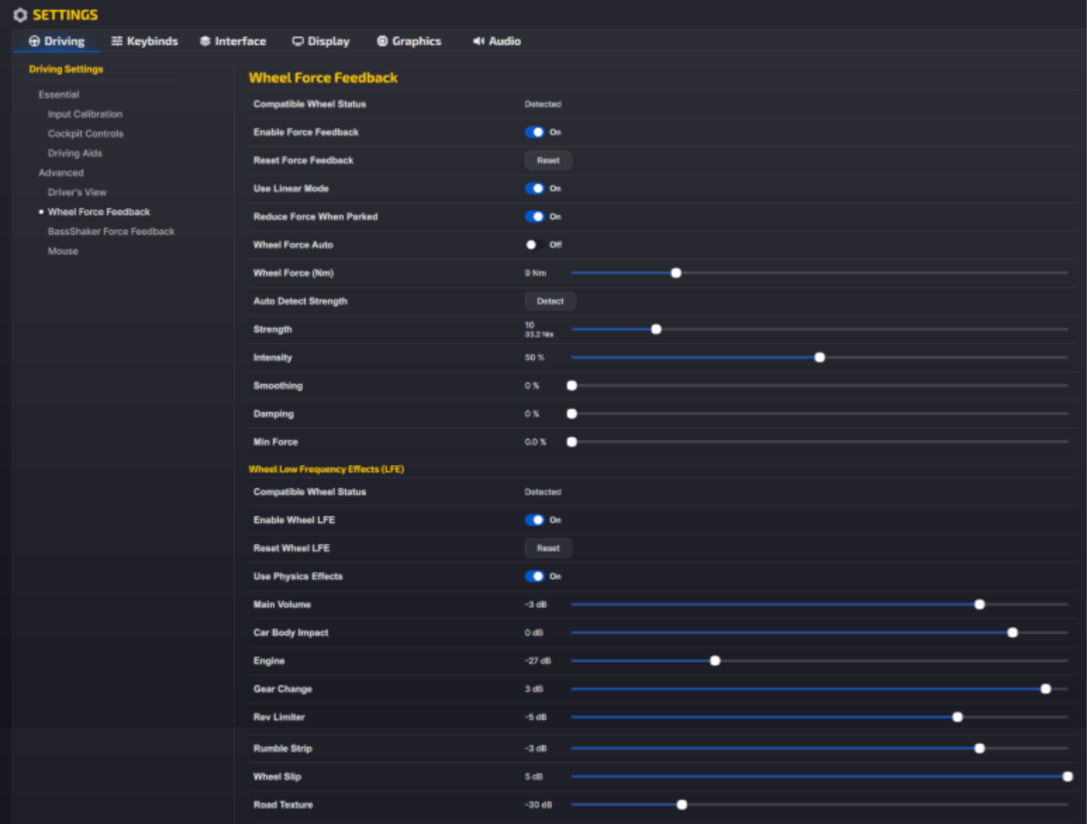 Dado que los ajustes del juego son subjetivos, las siguientes sugerencias te ayudarán a determinar qué ajustes pueden mejorar tu experiencia de juego. Cuando es relevante, hemos incluido la pantalla de configuración del volante, así como la configuración del juego. Todos estos ajustes asumen que el volante está configurado a 8 N⋅m de intensidad. Puedes configurar el amortiguador más bajo si usas el volante con una intensidad menor. Siéntete libre de experimentar con tus propios ajustes para personalizar el volante según tus preferencias.