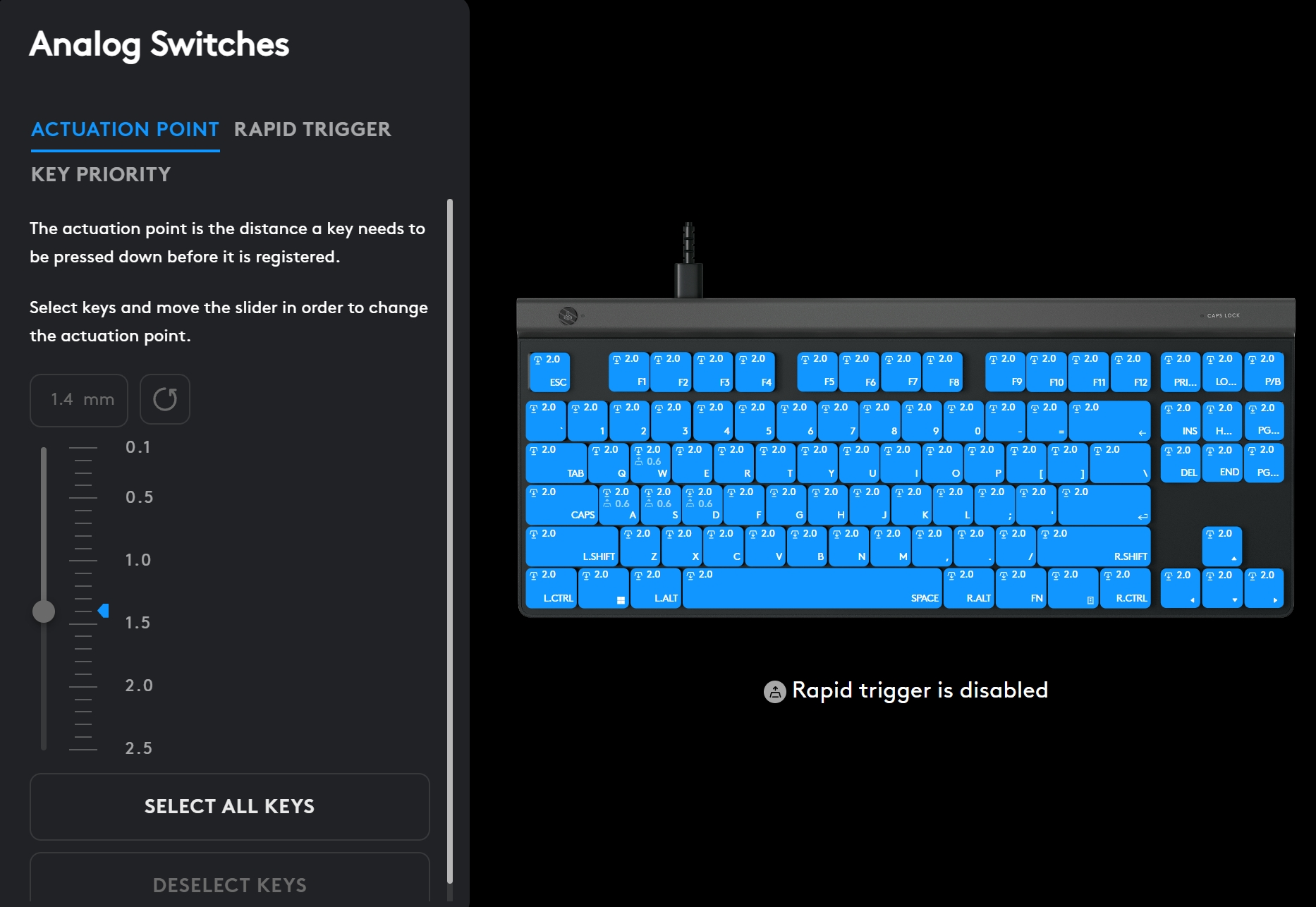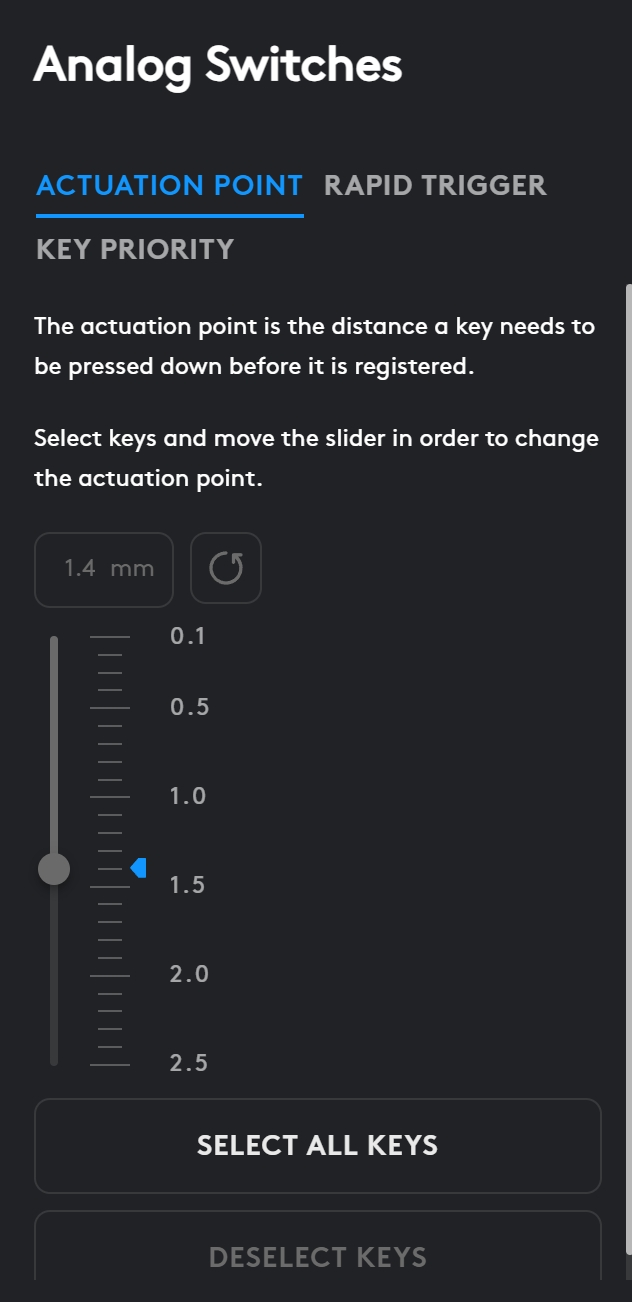 Le point d'actionnement est réglable entre 0,1 mm et 2,5 mm avec un minimum de 0,1 mm. Plus ce chiffre est élevé, moins il devient sensible. Pour le gaming, nous recommandons un point de 1 à 1,8 mm et pour le bureau, 2,2 mm.