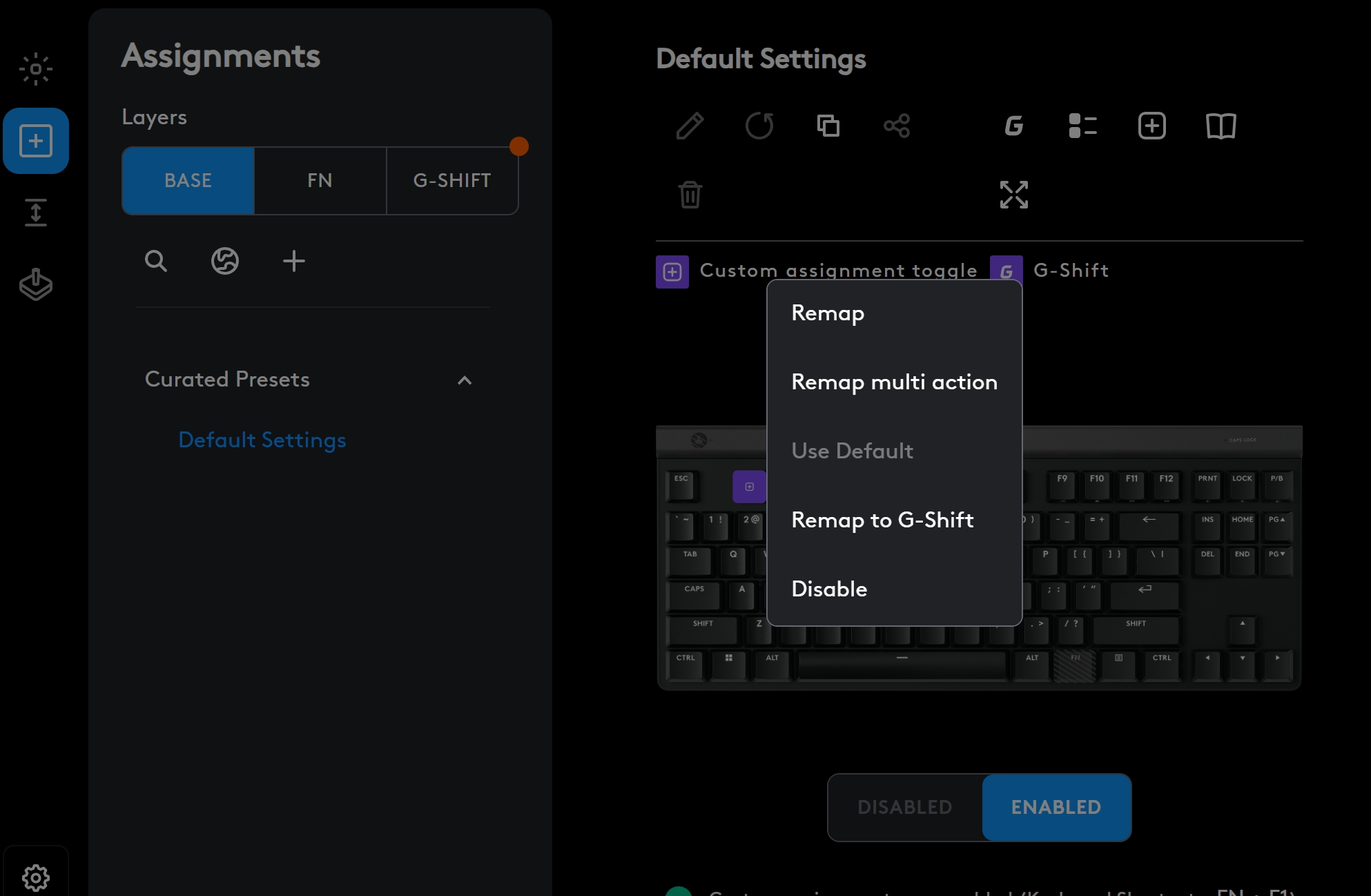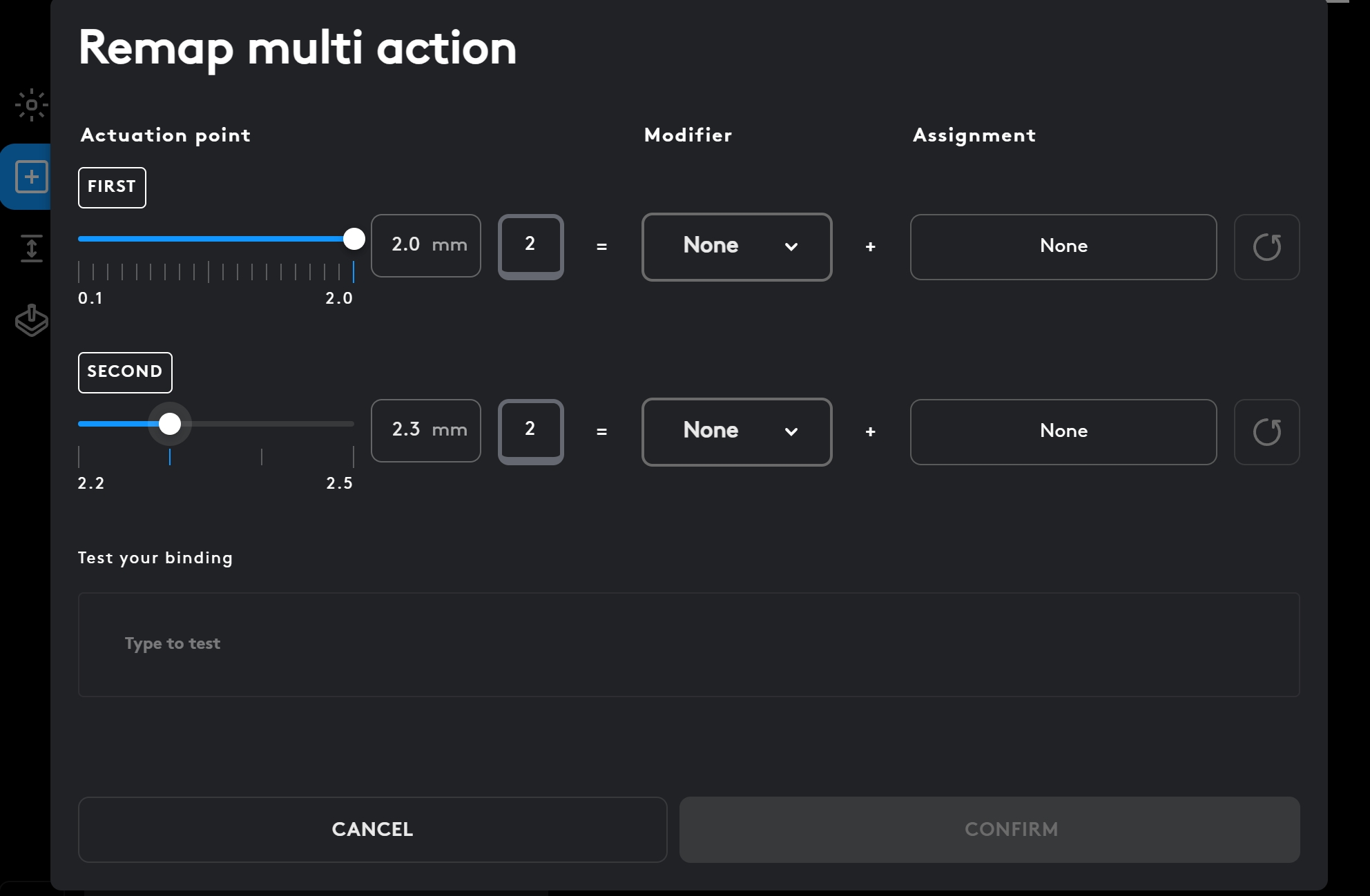 Remarque : les actions multiples ne peuvent être affectées que sur la couche de base et uniquement si le déclencheur rapide est désactivé.