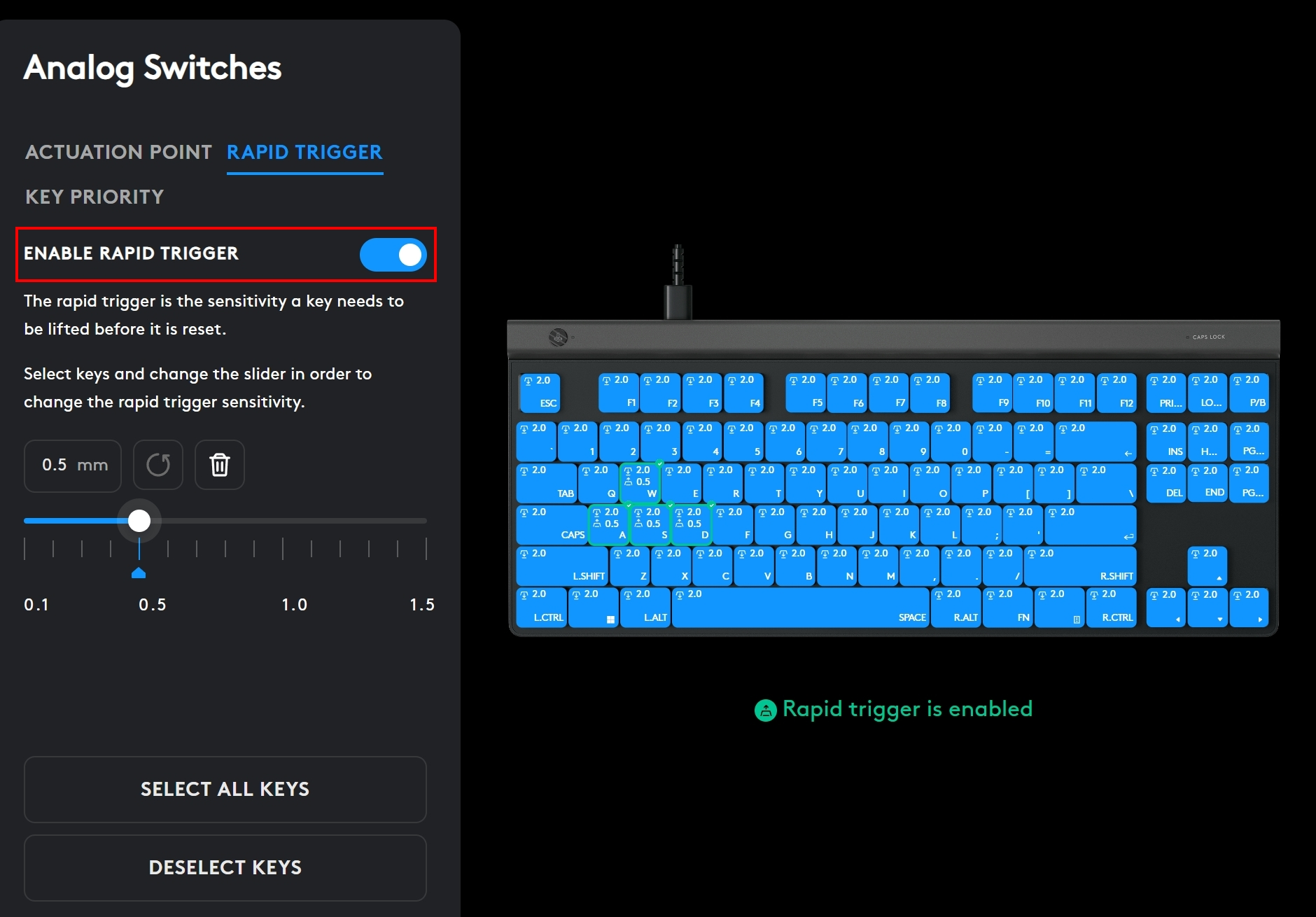 Le déclencheur rapide change dynamiquement le point d'actionnement et de désactivation. Vos touches s'activent lorsque vous avez l'intention d'appuyer dessus et se désactivent lorsque vous avez l'intention de les lâcher. Vous pouvez répéter une pression sur une touche en plein mouvement sans avoir à dépasser un point de réinitialisation ou de commutation fixe pour une pression rapide. La sensibilité de déclenchement rapide peut être appliquée à chaque touche indépendamment ou à toutes les touches. Cependant, la sensibilité reste constante.