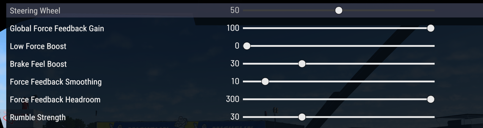 Omdat game-instellingen subjectief zijn, zijn de volgende suggesties bedoeld om je te helpen bepalen welke instellingen je game-ervaring kunnen verbeteren. Waar relevant hebben we de instellingen van het stuurwiel en de ingame-instellingen toegevoegd. Bij deze instellingen wordt ervan uitgegaan dat je stuurwiel is ingesteld op 8 Nm. Je kunt de dempingsinstellingen lager instellen als je het stuurwiel op een lagere kracht zet. Experimenteer met je eigen instellingen om het stuurwiel naar wens aan te passen.