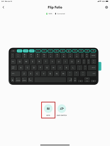 Logi Options+ Mobile Uygulamasında Flip Folio özelliğini seçin ve ardından Tuşlar seçeneğine dokunun.