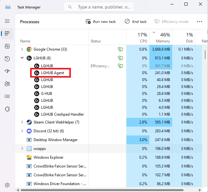 - 從系統匣結束名稱為「LGHUB Agent」的處理程序。